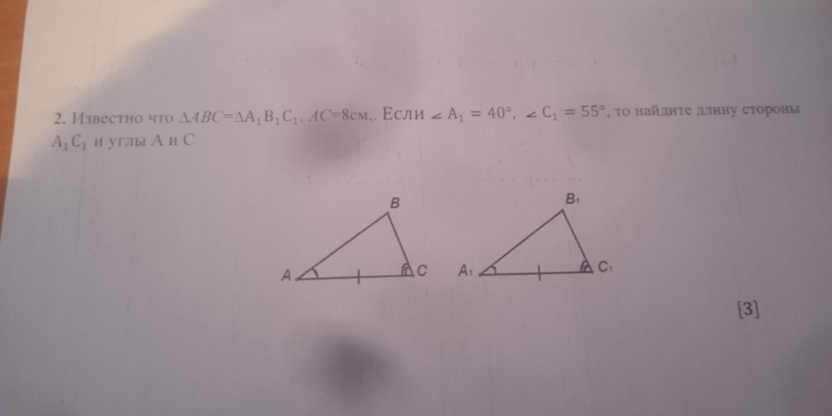 если эти 2 треугольника равны, то и соответствующие элементы в них тоже равны. Угол А=углу А1, значит угол А 40°. Сторона АС равна стороне А1С1=8 см. Угол С равен углу С1=55°