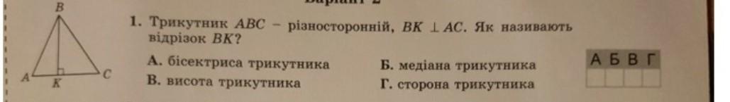 Трикутник ABC - різносторонній, BK I AС. Як називають вiдрiзок ВК? дай 20 баллов