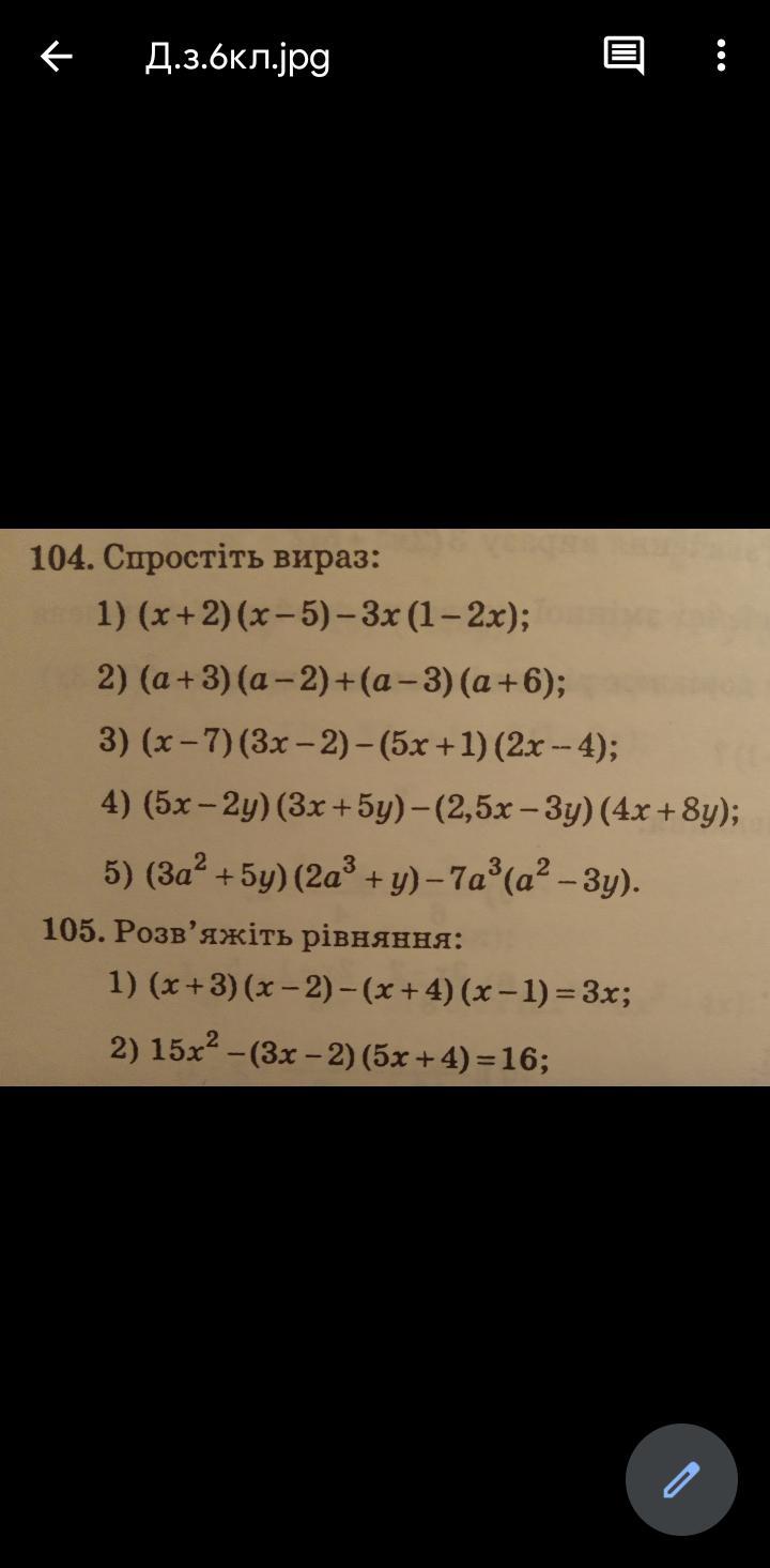 104(1,2): 1) (х+2) (х-5)-3х(1-2х)=х^2 - 5х+2х-10-3х+6х^2=7х^2-6х