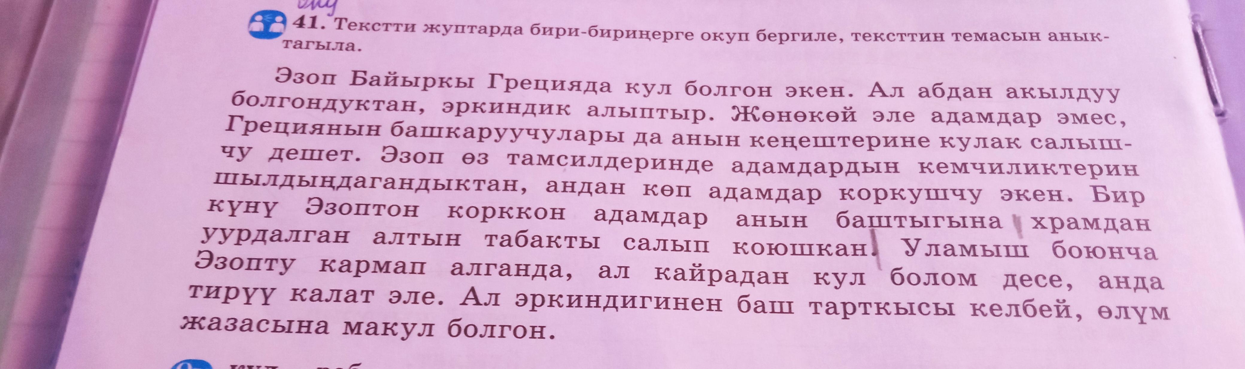45. Эзоп туура чечим кабыл алды деп ойлойсунарбы? Эмне үчүн? Өз оюнарды төмөнкү сүйлөмдөрдү улантып жазып келгиле. Мен деп ойлойм... Биринчиден..., Экинчиден...,Үчүнчүдөн..., Демек ...