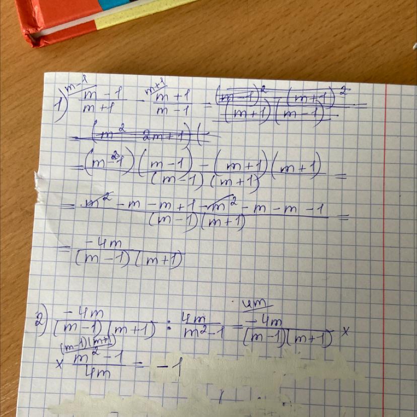(m-1/m+1 - m+1/m-1) : 4m/m²-1 = (m-1)²/(m+1)(m-1) - (m+1)²/(m+1)(m-1) : 4m/m²-1 = m² - 2m + 1/m²-1 - (m² + 2m + 1/m² - 1) : 4m/m²-1 = m² - 2m + 1/m²-1 - m² - 2m + 1/m² - 1) : 4m/m²-1 = -4m/m²- 1 : 4m/m²-1 = -4m/m²- 1 • m²-1/4m = -1