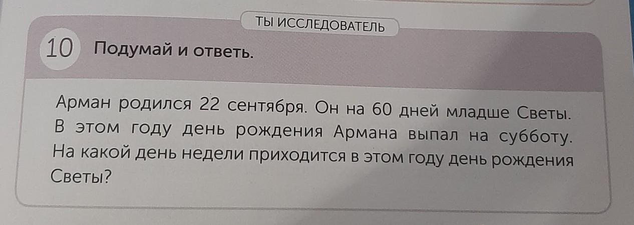 ТЫ ИССЛЕДОВАТЕЛЬ 10 Подумай и ответь. Арман родился 22 сентября. Он на 60 дней младше Светы. В этом году день рождения Армана выпал на субботу. На какой день недели приходится в этом году день рождения Светы?