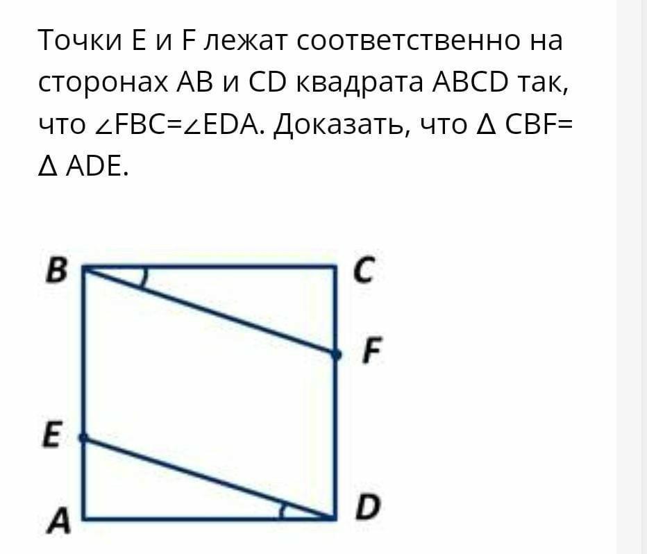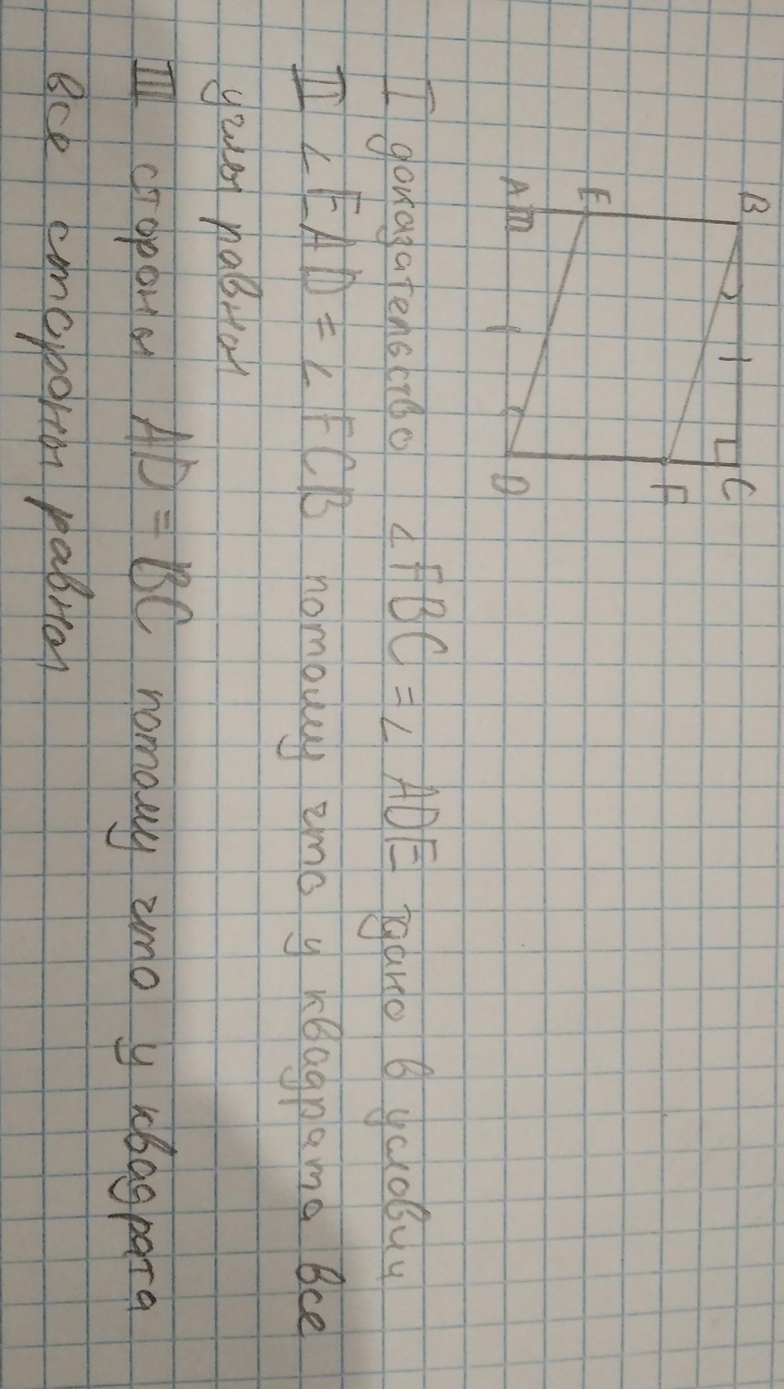 Если это квадрат то значит все его стороны и углы равны => сторона AD = BC и уголЕАD = углуFCB. По второму признаку ∆EAD =∆FBC