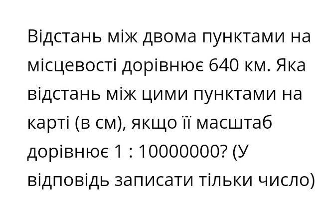 Відстань між двома пунктами на місцевості дорівнює 640 км. Яка відстань між цими пунктами на карті (в см), якщо її масштаб дорівнює 1 : 10000000? (У відповідь записати тільки число)