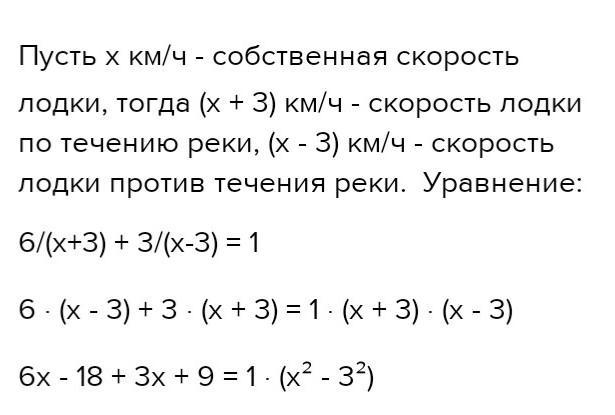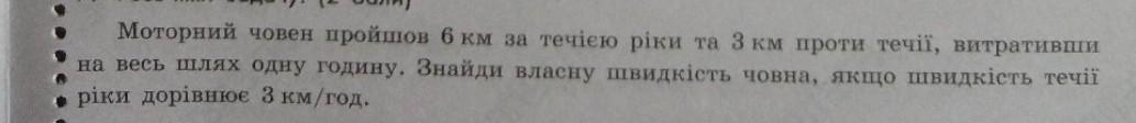 Моторний човен пройшов 6 км за течією рiки та 3 км проти течії, витративши на весь шлях одну годину. Знайди власну швидкість човна, якщо швидкість течії • рiки дорівнює 3 км/год.