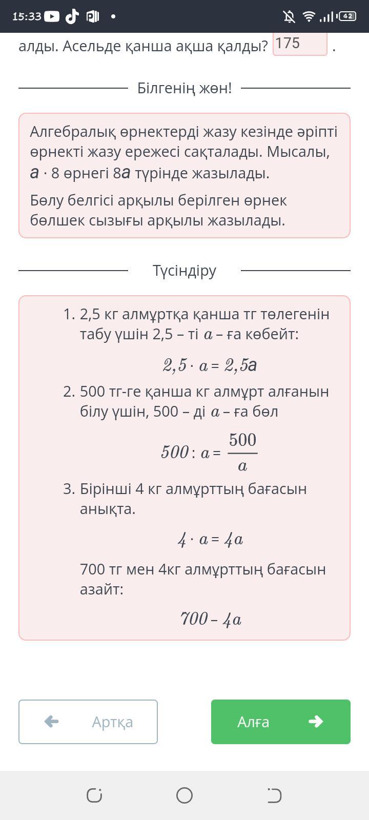 1 кг алмұрттың бағасы а тг. 2,5 кг алмұрт сатып алу үшін қанша төлеу керек? 500 тг-ге қанша кг алмұрт сатып алуға болады? Асельде 700 тг бар, ол 4 кг алмұрт сатып алды. Асельде қанша ақша қалды?