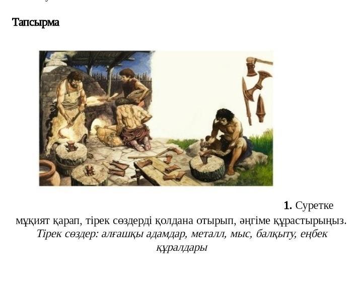 1. Суретке мұқият қарап, тірек сөздерді қолдана отырып, әңгіме құрастырыңыз. Тірек сөздер: алғашқы адамдар, металл, мыс, балкыту, еңбек құралдары пжжжж көмектесіп жіберіңізші керек болып тұр қатты