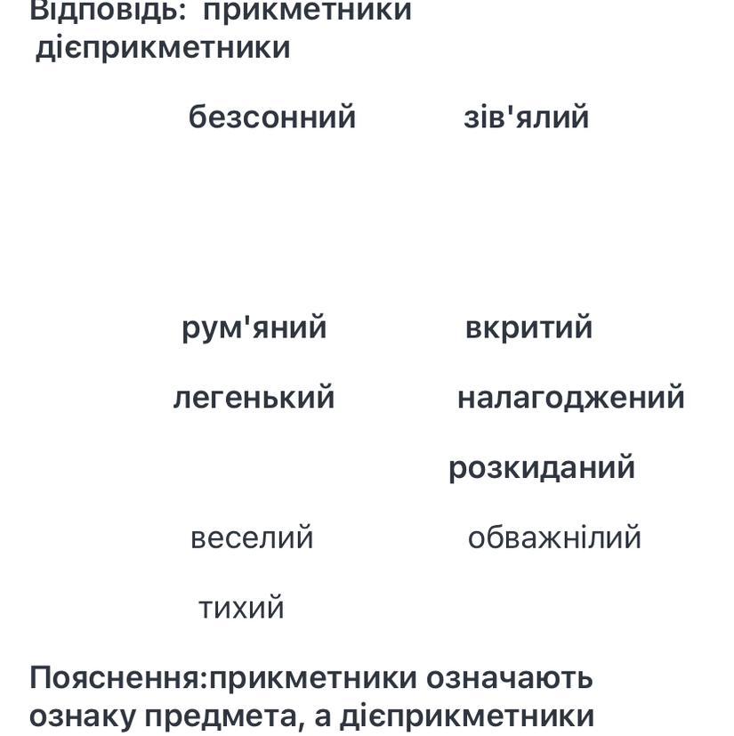 2.2. Розподiльний диктант. Запишіть у 1 колонку прикметники, а в 2-дієприкметники. Безсонний, зів'ялий, рум'яний, вкритий, легенький, налагоджений, розкиданий, обважнілий, веселий, тихий.