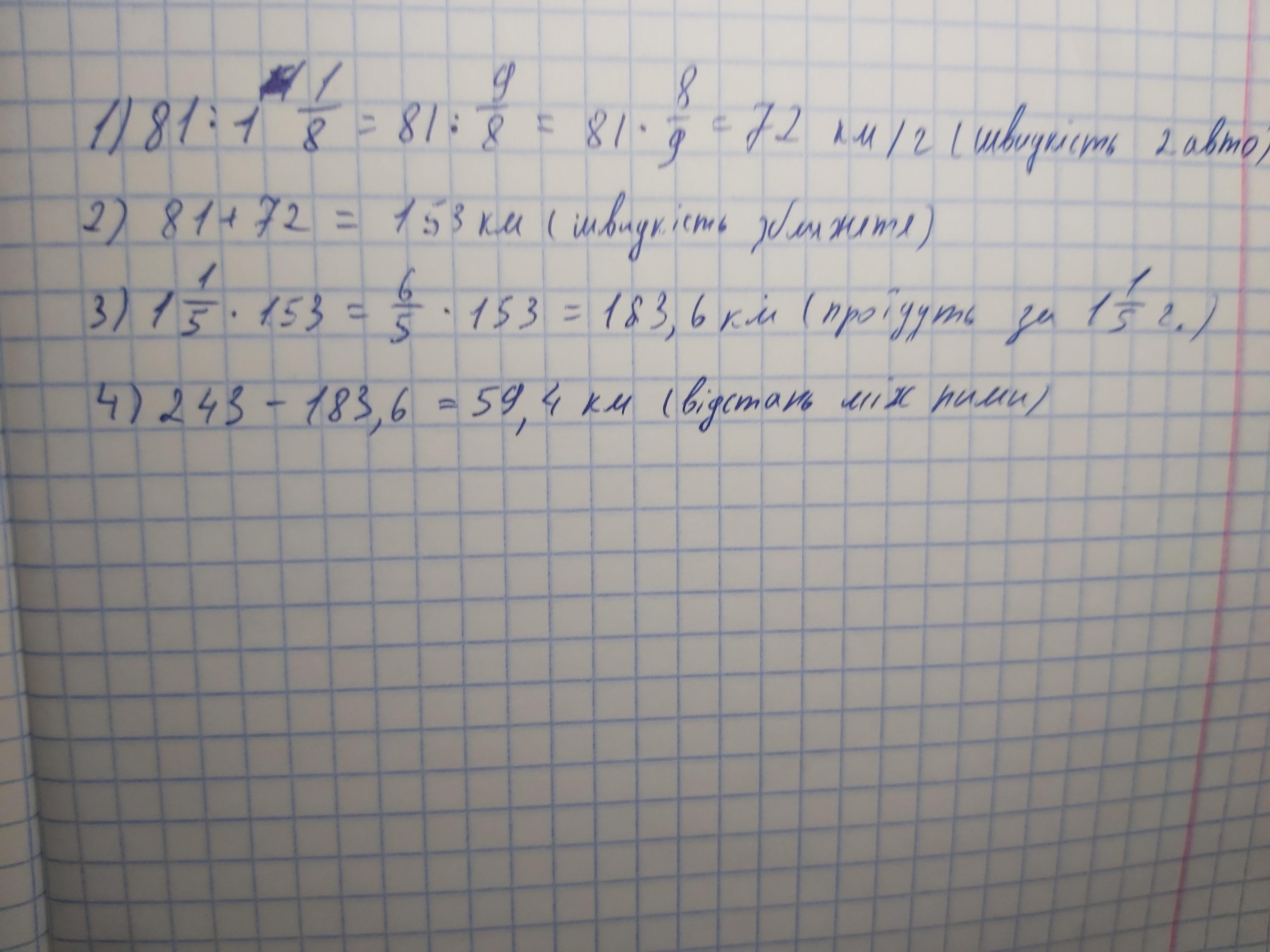 з двох міст одночасно назустріч один одному вирушили два автомобілі. швидкість одного із них 81 км/год, а другого в 1 1/8 раза менша. якою буде відстань між автомобілями через 1 1/5год після початку руху, якщо відстань між містами 243 км Допоможіть Швидко