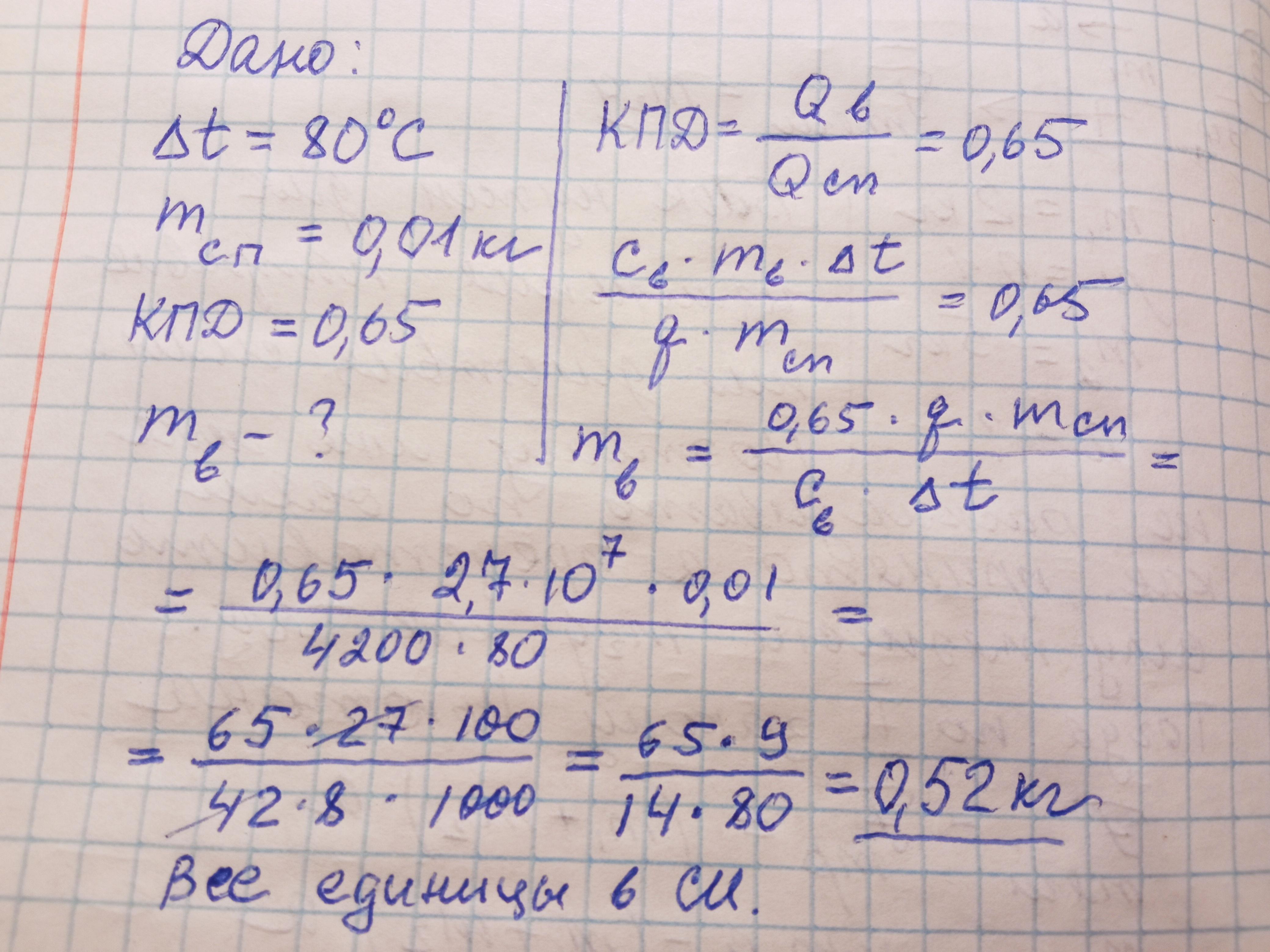 Скільки води нагріли на спиртівці на 80 °С, якщо на нагрівання витрачено 10 г спирту, а ККД нагрівника становить 65%?