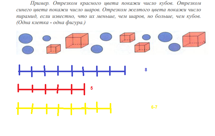 Отрезком красного цвета покажите число кубов. Отрезком синего цвета покажите число шаров. Отрезком желтого цвета покажите число пирамид, если известно, что их меньше, чем шаров, но больше, чем кубов. (Одна клетка- одна фигура)