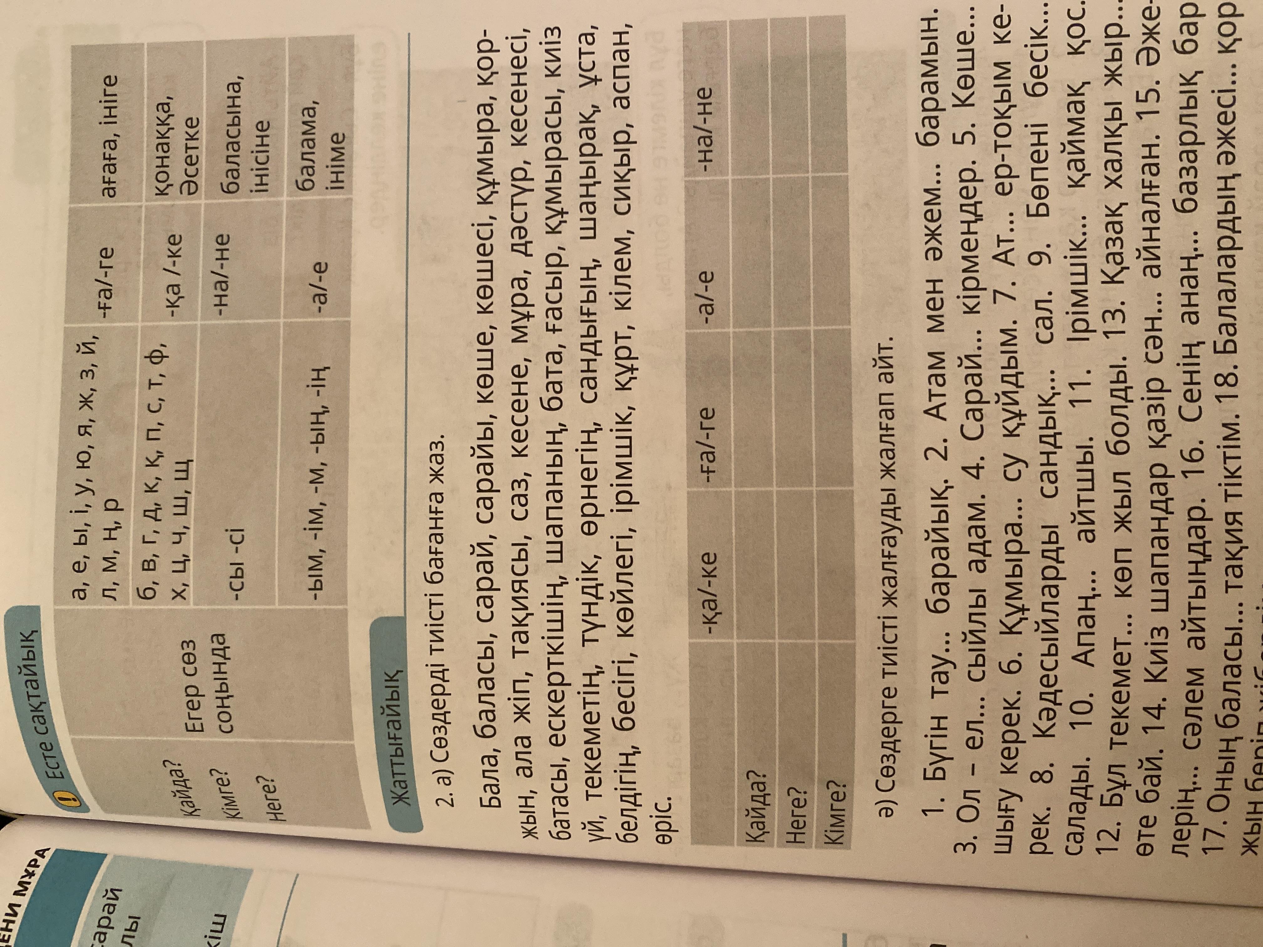 балаға,баласына,сарайына,көшеге,көшесіне, құмыраға,қоржынға,ала жіпке,тақиясына,кесенеге,мұраға, киіз үйге,текеметіңе,түндікке,өрнегіне,сандығыңа,шаңыраққа,ұстаға,белдігіңе,бесігіне,көйлегіне,ірімшікке,құртқа,кілемге,сиқырға,аспанға,өріске