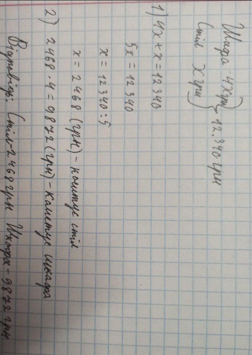 У меблевому магазині сім'я Васильченко придбала шафу та стіл, заплативши за покупку 12 340 грн. Скільки гривень коштує шафа та стіл окремо, якщо стіл дешевший за шафу у 4 рази?