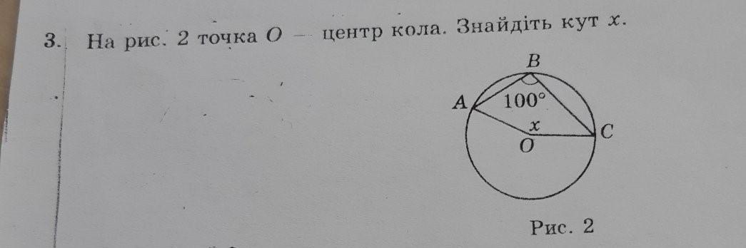 На рис. 2 точка O - центр кола. Знайдіть кут x.