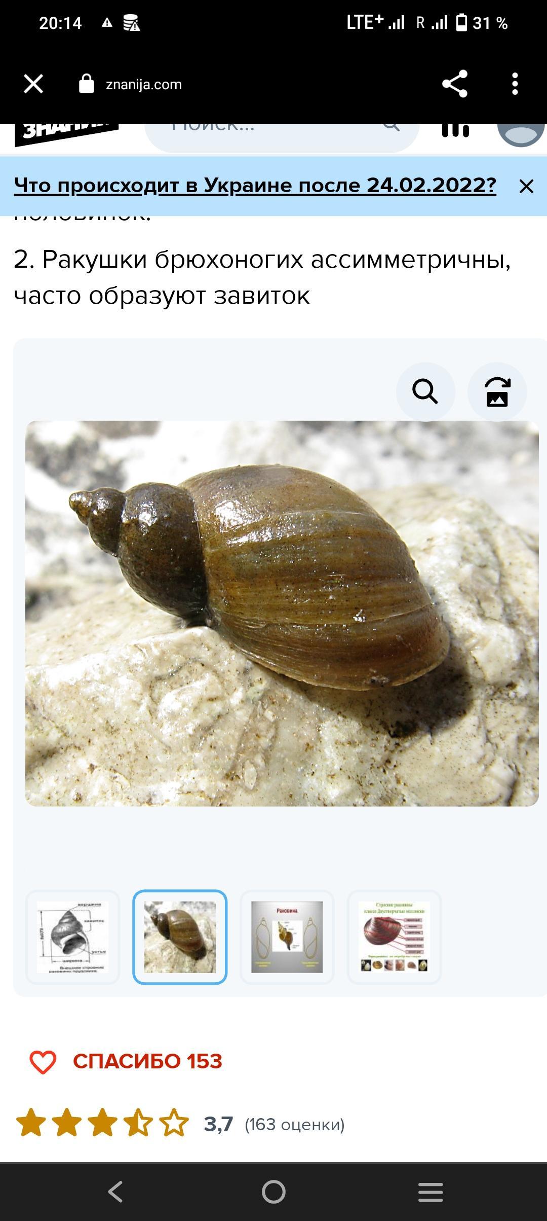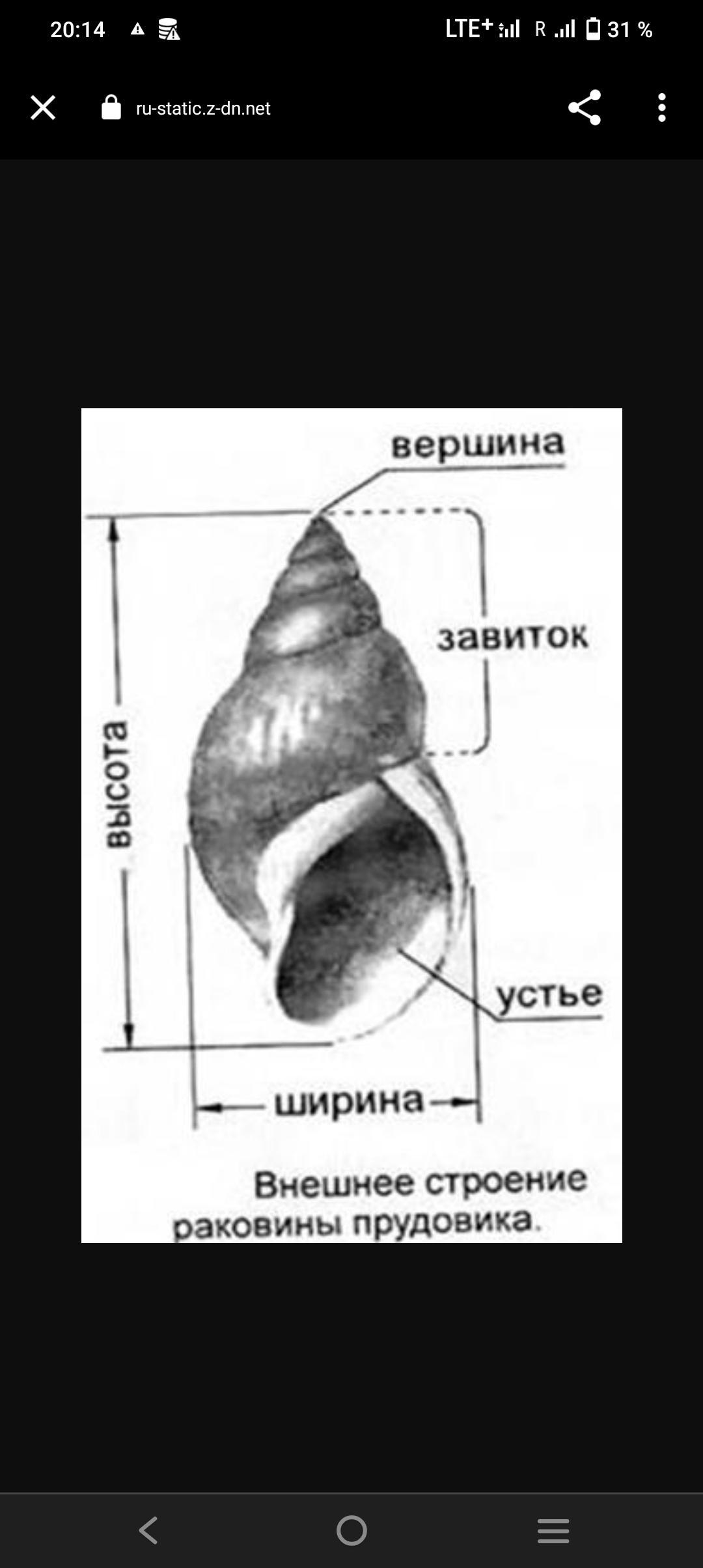 1. Рассмотрите раковину прудовика (или другого брюхоногого моллюска). Определите ее цвет и измерьте длину. Найдите отверстие, через которое выдвигается голова и нога моллюска.