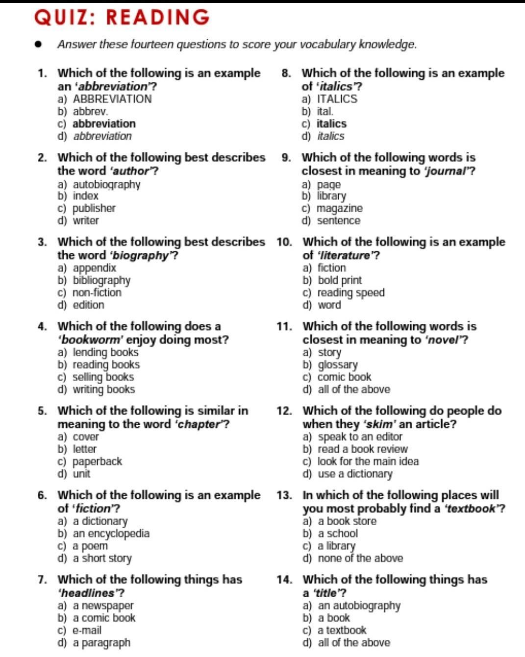 ТЕРМІНОВО !! ДАЮ 50 БАЛІВ QUIZ: READING • Answer these fourteen questions to score your vocabulary knowledge. 1. Which of the following is an example 8. Which of the following is an example an 'abbreviation'? of 'italics'? a) ABBREVIATION b) abbrev. a) ITALICS b) ital. c) abbreviation c) italics d) abbreviation d) italics 2. Which of the following best describes 9. Which of the following words is the word 'author"? closest in meaning to 'journal"? a) autobiography b) index c) publisher d) writer 4. Which of the following does a 'bookworm' enjoy doing most? a) lending books b) reading books c) selling books d) writing books 3. Which of the following best describes 10. Which of the following is an example the word 'biography? of 'literature'? a) appendix b) bibliography c) non-fiction d) edition 5. Which of the following is similar in meaning to the word 'chapter"? a) cover b) letter c) paperback d) unit 6. Which of the following is an example of 'fiction'? a) a dictionary b) an encyclopedia c) a poem d) a short story 7. Which of the following things has 'headlines'? a) a newspaper b) a comic book c) e-mail d) a paragraph a) page b) library c) magazine d) sentence 13. a) fiction b) bold print c) reading speed d) word 11. Which of the following words is closest in meaning to 'novel'? a) story b) glossary c) comic book d) all of the above 12. Which of the following do people do when they 'skim' an article? a) speak to an editor b) read a book review look for the main idea d) use a dictionary In which of the following places will you most probably find a 'textbook'? a) a book store b) a school c) a library d) none of the above 14. Which of the following things has a 'title'? a) an autobiography b) a book c) a textbook d) all of the above