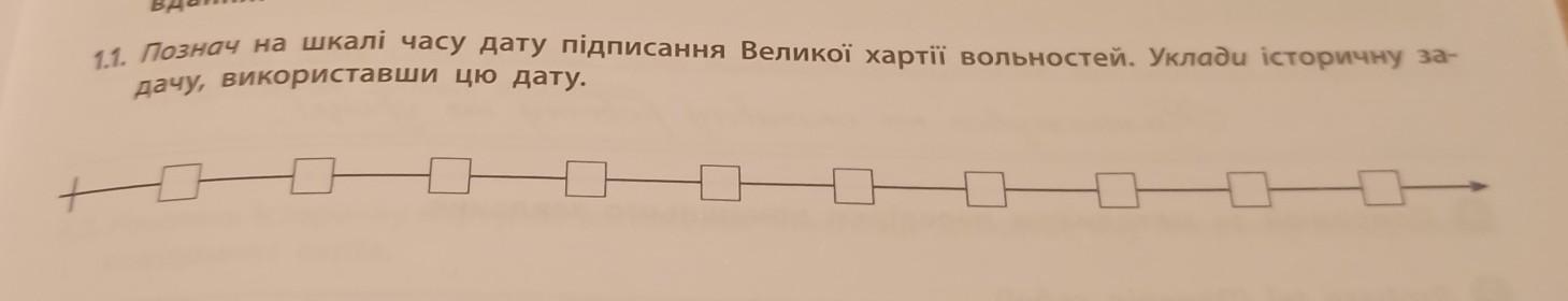 11. Познач на шкалі часу дату підписання Великої хартії вольностей. Уклади історичну за- дачу, використавши цю дату. СРОЧНО ДАЮ МНОГО БАЛЛОВ