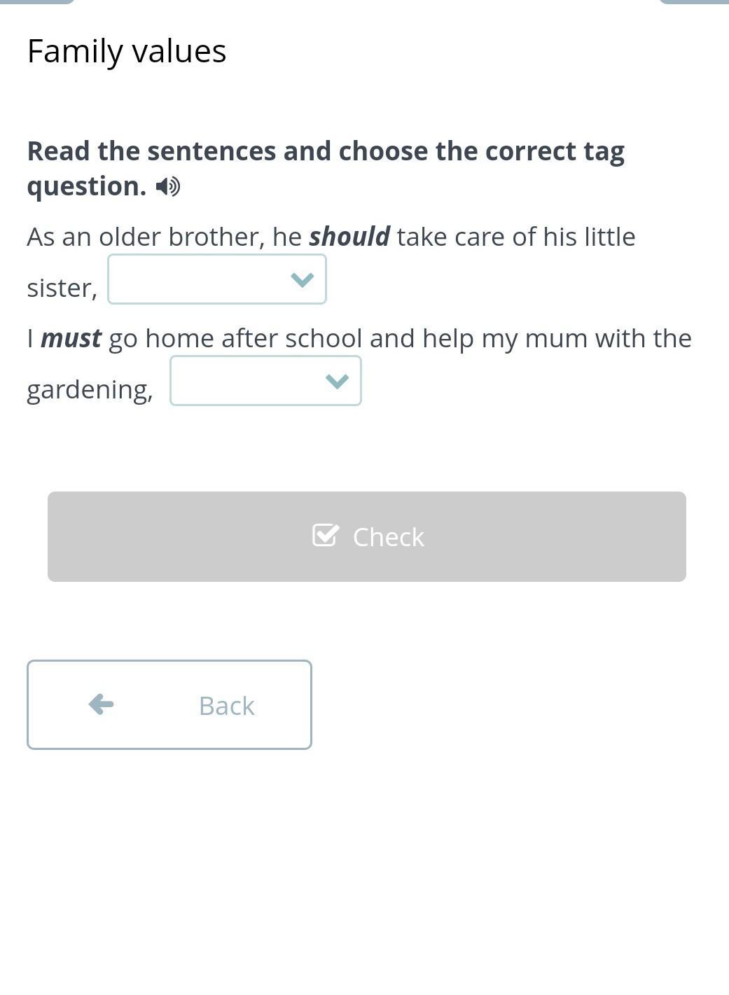 Read the sentences and choose the correct tag question. As an older brother, he should take care of his little sister, I must go home after school and help my mum with the gardening, помогите)((
