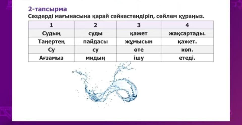 2-тапсырма Сөздерді мағынасына 1 Судың Таңертең Cy Ағзамыз қарай сәйкестендіріп, сөйлем құраңыз. 2 4 суды жақсартады. пайдасы қажет. су көп. мидың етеді. 3 қажет жұмысын ӨТЕ ішу
