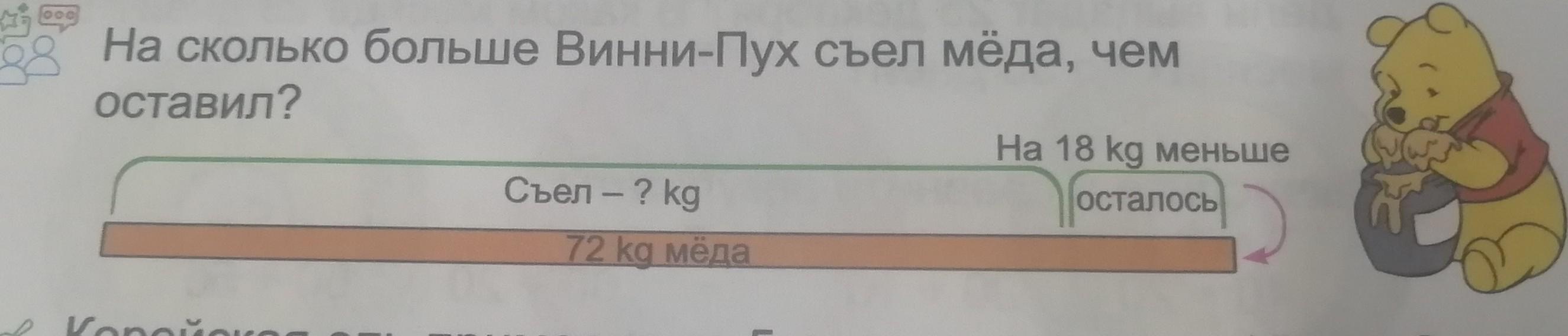 На сколько больше Винни-Пух съел мёда, чем оставил?Съел - ? kg 72 kg мёда На 18 kg меньше осталось