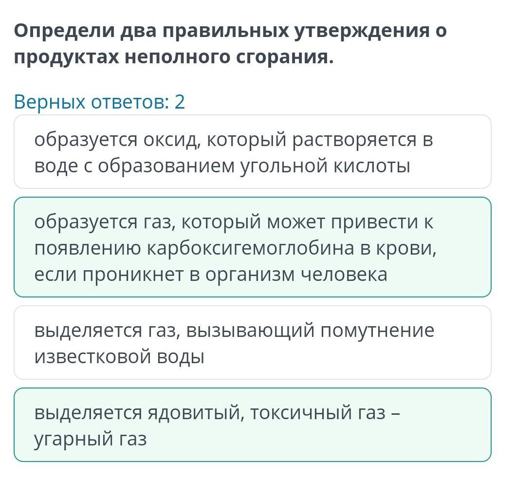 Определи два правильных утверждения о продуктах неполного сгорания. Верных ответов: 2