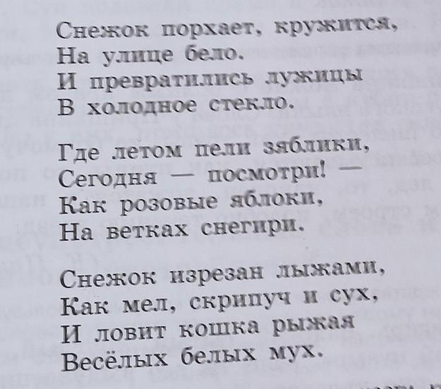 снежок изрезан лыжами, ловит кошка рыжая веселых белых мух.