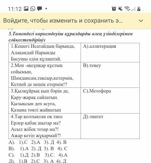 Жауабы Д) 1-В 2-С 3-А 4-Д