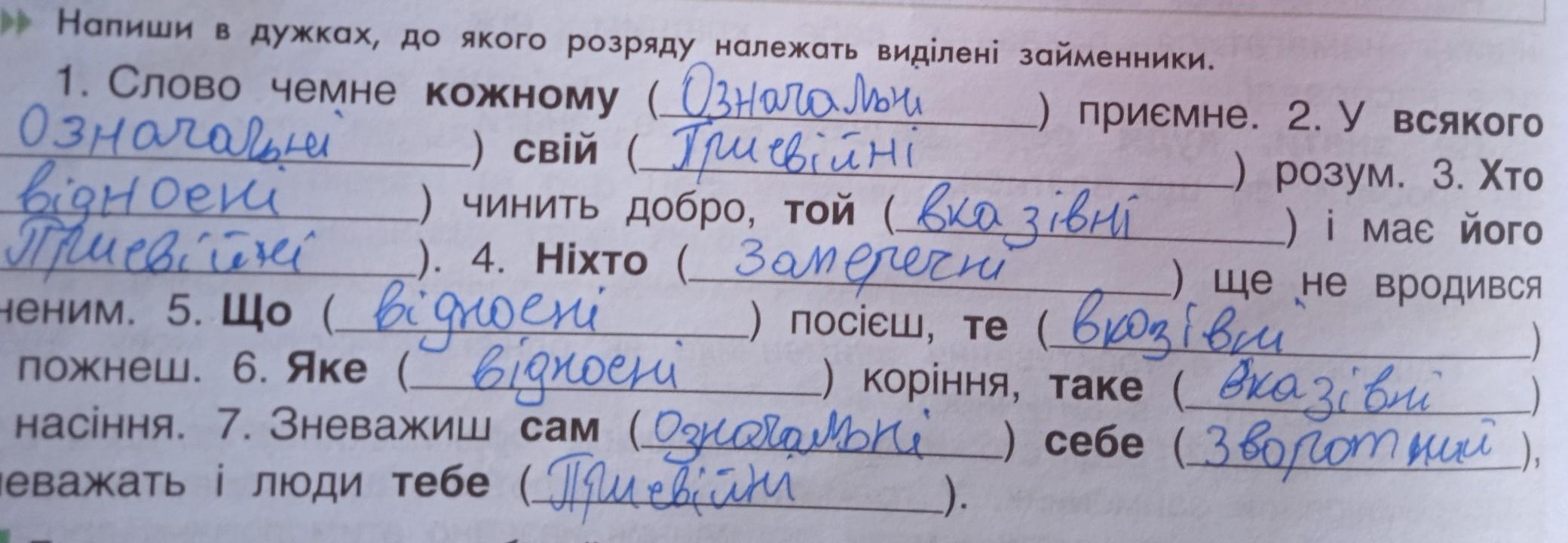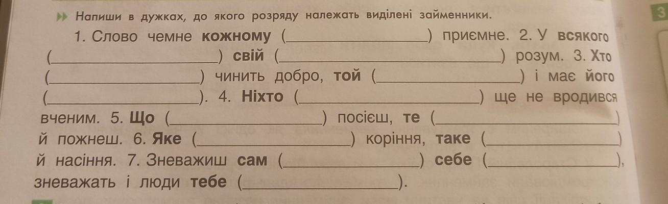 » Напиши в дужках, до якого розряду належать видiленi займенники. 1. Слово чемне кожному СВIЙ чинить добро, той ). 4. Ніхто вченим. 5. Що й пожнеш. 6. Яке й насіння. 7. Зневажиш сам зневажать i люди тебе _) посієш, те 2) приємне. 2. У всякого розум. 3. Хто ) і має його _) ще не вродився _) корiння, таке себе