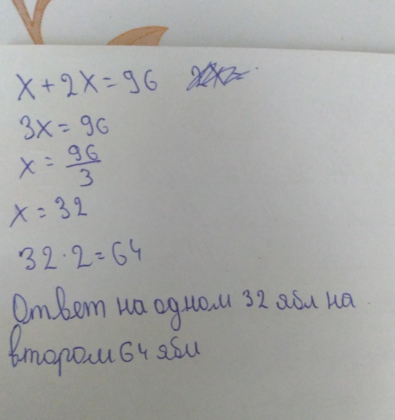 На двох яблунях разомросте 96 яблук, до того ж на другій-у двічі більше,ніж на першій. Скільки яблук росте окремо на кожній яблуні (Починати розвязання зі слів: