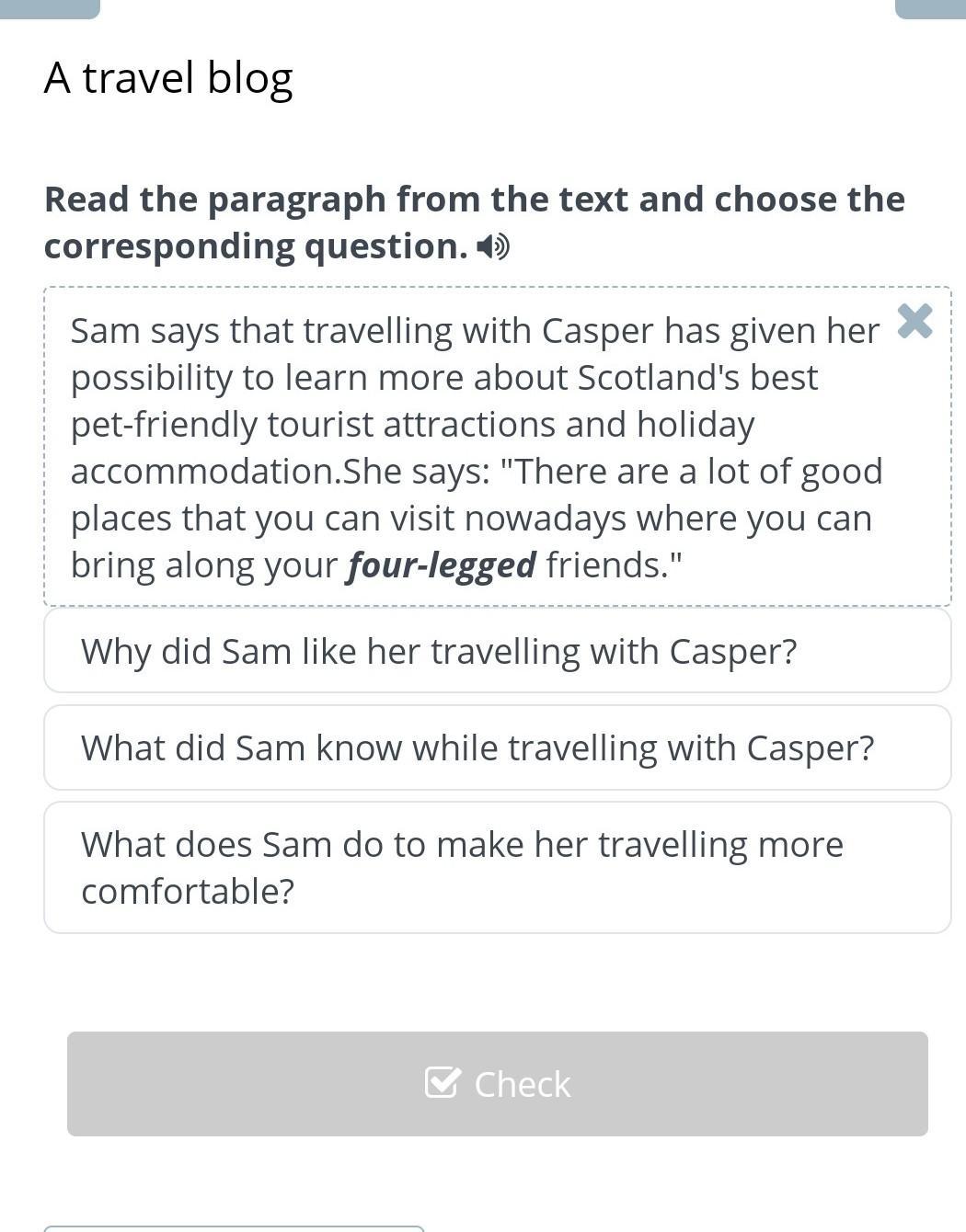 travel blog Read the paragraph from the text and choose the corresponding question. Sam says that travelling with Casper has given her possibility to learn more about Scotland's best pet-friendly tourist attractions and holiday accommodation.She says: "There are a lot of good places that you can visit nowadays where you can bring along your four-legged friends." Why did Sam like her travelling with Casper? What did Sam know while travelling with Casper? What does Sam do to make her travelling more comfortable?