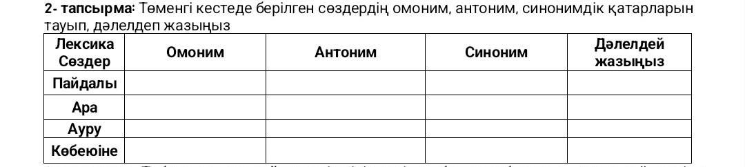 2- тапсырма: Төменгi кестеде берілген сөздердің омоним, антоним, синонимдік қатарларын тауып, дәлелдеп жазыныз Омоним