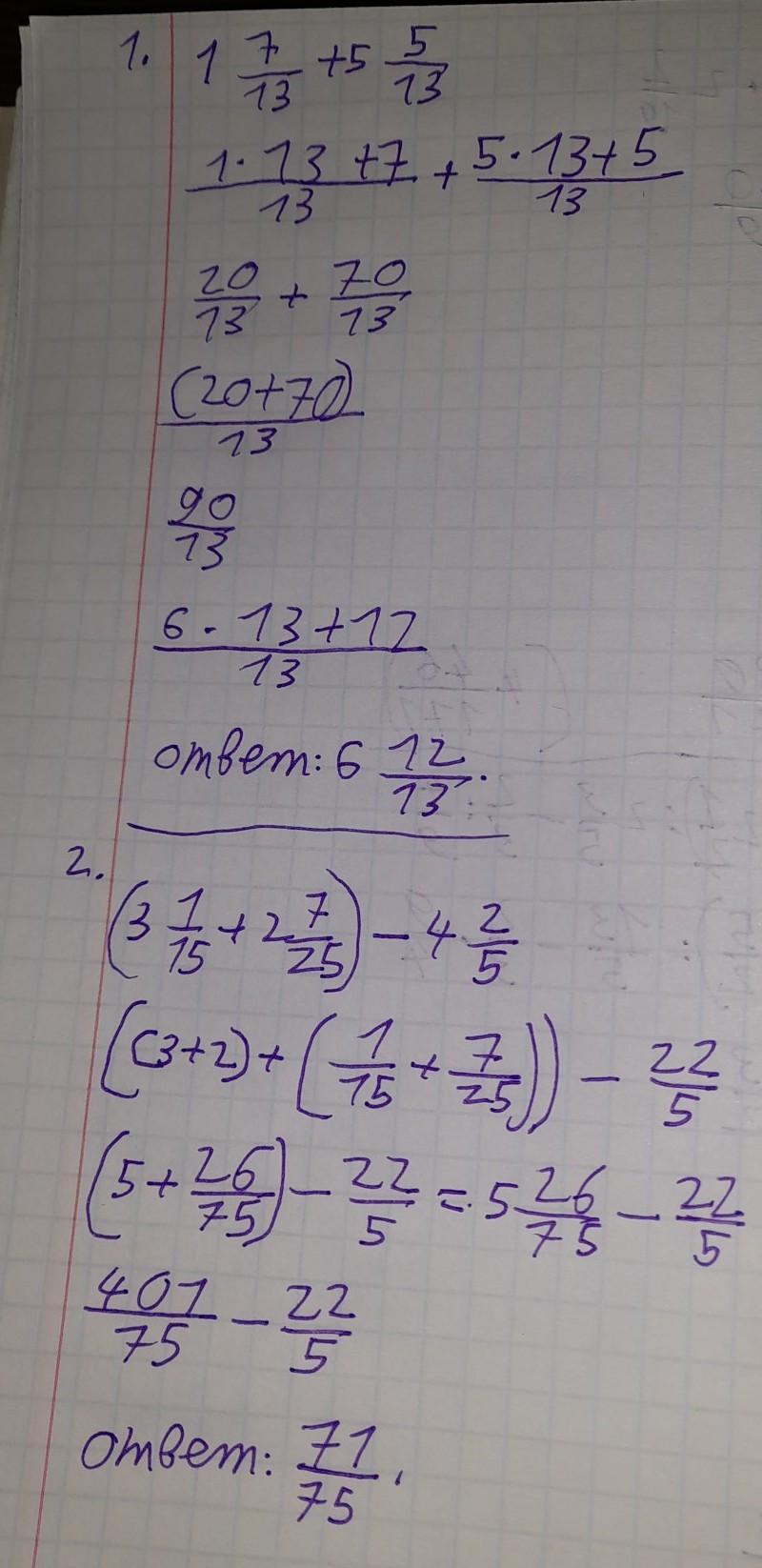(3 1/15 + 2 7/25) - 4 2/5 = (3 5/75 + 2 21/75) - 4 30/75 = 5 26/75 - 4 30/75 = 4 101/75 - 4 30/75 = 71/75