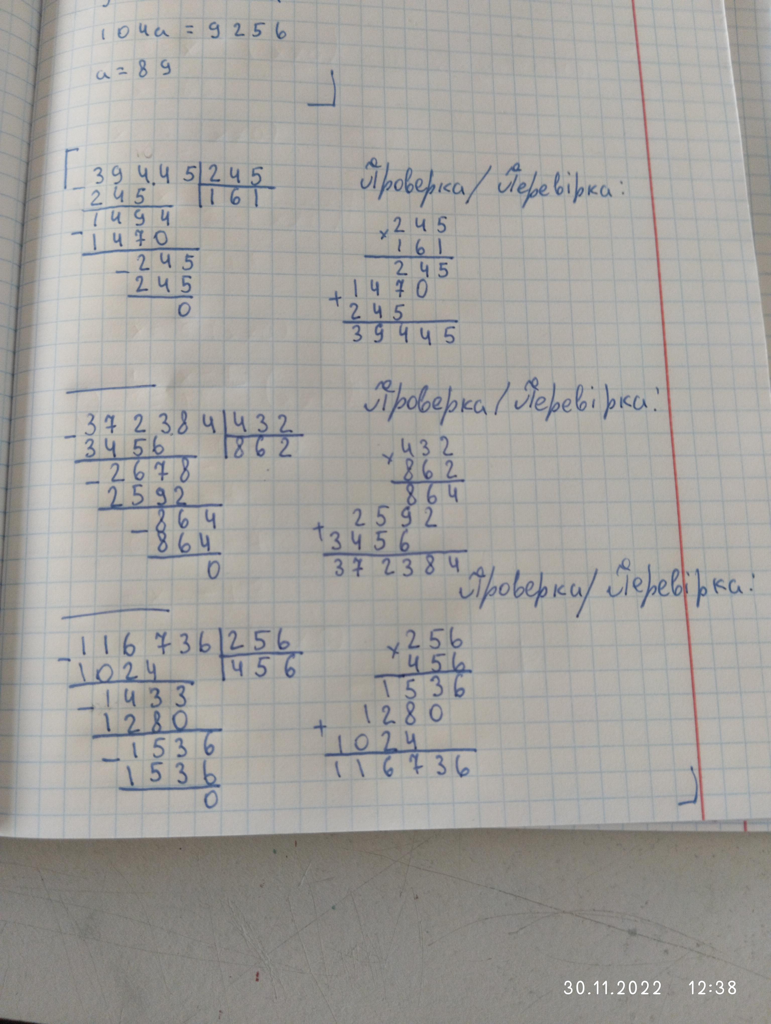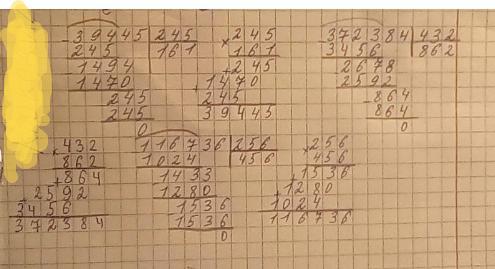 39445:245 ОПРЕДЕЛЯЕШЬ НЕПОЛНОЕ ДЕЛИМОЕ 394, ПОДБИРАЕШЬ ЧИСЛО В ОТВЕТ СКОЛЬКО РАЗ 245 МОЖЕТ БЫТЬ В ЧИСЛЕ 394, МОЖЕТ БЫТЬ ОДИН РАЗ ЗНАЧИТ В ОТВЕТ ВПИСЫВАЕМ 1.394-245=149 И СПУСКАЕМ 4 ПОЛУЧАЕТСЯ 1494, СКОЛЬКО РАЗ ЧИСЛО 245 МОЖЕТ ПОМЕСТИТЬСЯ В ЧИСЛО 1494? МОЖЕТ ПОМЕСТИТЬСЯ 6РАЗ ВПИСЫВАЕМ ЧИСЛО 6 В ОТВЕТ, 6*245=1470, 1494-1470=24 К 24 СПУСКАЕМ ЧИСЛО 5И ПОЛУЧАЕМ 245, СКОЛЬКО РАЗ В ЧИСЛЕ 245 ПОМЕСТИТЬСЯ ЧИСЛО 245? ПОМЕСТИТЬСЯ ВСЕГО ЛИШЬ ОДИН РАЗ, ВПИСЫВАЕМ В ОТВЕТ 1,В ОТВЕТЕ ПОЛУЧАЕТСЯ 161. ПРОДОЛЖАЕМ СТОЛБИК, 245-245=0 ВОТ И ГОТОВО