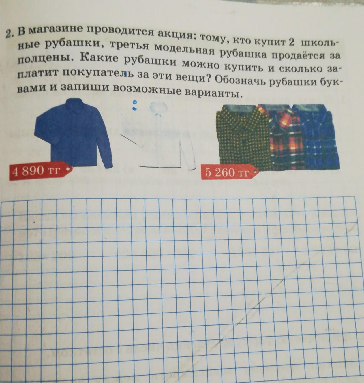 2. В магазине проводится акция: тому, кто купит 2 школь ные рубашки, третья модельная рубашка продается за полцены. Какие рубашки можно купить и сколько за платит покупатель за эти вещи? Обозначь рубашки бук вами и запиши возможные варианты. 4 890 тг 5 260 тг
