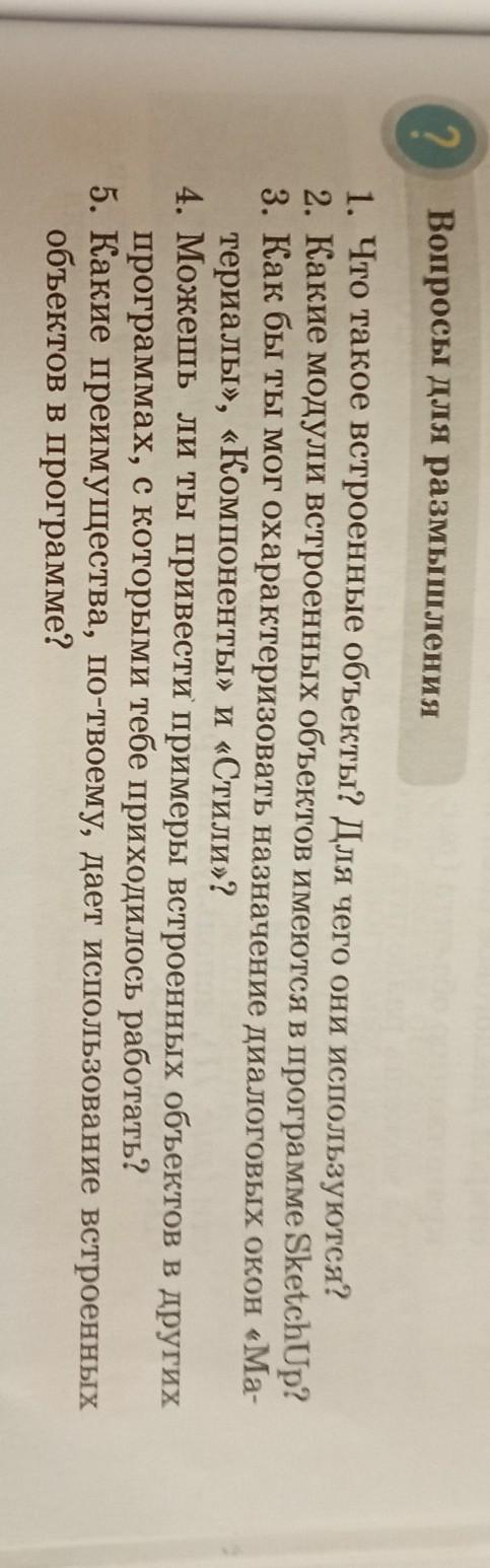 вопросы для размышления. 1 какие встроенные объекты? для чего они используются?5. какие модули встроенных объектов имеют в программе в программе SketchUp? 3. как бы ты охарактизировать назначение диалоговых окон "материалы" , "компоненты", и "Стили"? 4. можешь ли ты привезти примеры стройных работ в других программах, с которыми тебе приходится работать? 5. какие преимущества, по-твоему даёт использование встроенных объектов в программе