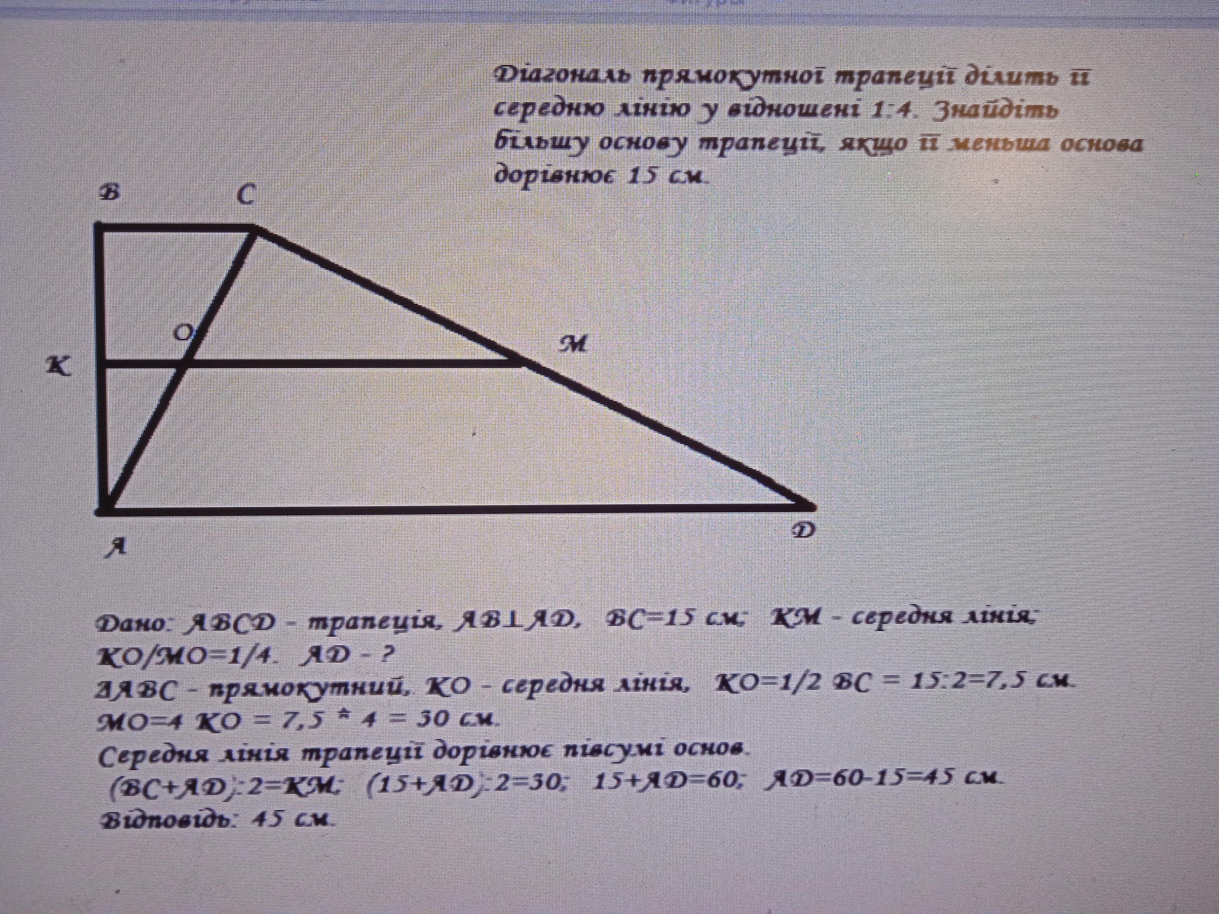 Діагональ прямокутної трапеції ділить її середню лінію у відношені 1:4. Знайдіть більшу основу трапеції, якщо її меньша основа дорівнює 15 см.