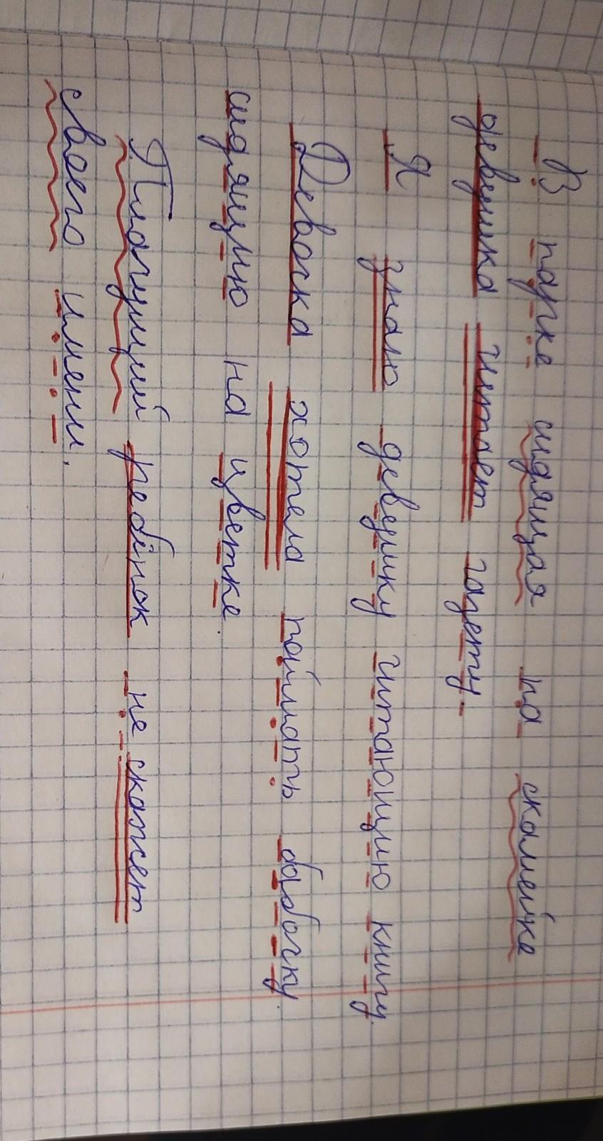Задание 1. Составьте предложения из слов, выполните синтаксический разбор получившихся предложений. 1.девушка, газету, в, читает, сидящая, на, парке, скамейке. 2.девушку, книгу, я, знаю, читающую 3.хотела, бабочку, на, сидящую, поймать, девочка, цветке. 4.своего, ребёнок, не, имени, плачущий, сказать