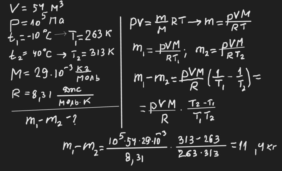 Визначити різницю мас повітря за атмосферним тиском, що заповнює приміщення об’ємом 54 м 3 взимку при температурі -100С і влітку при температурі +400С, враховуючи, що молярна маса повітря дорівнює 0,029 кг/моль. Для визначен
