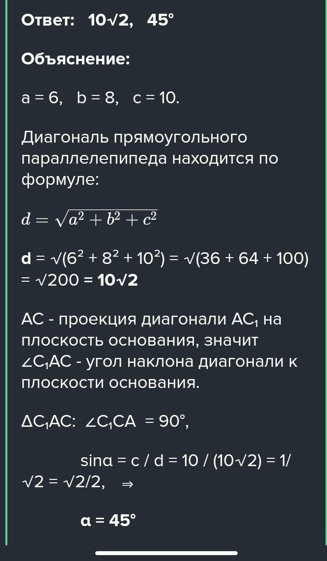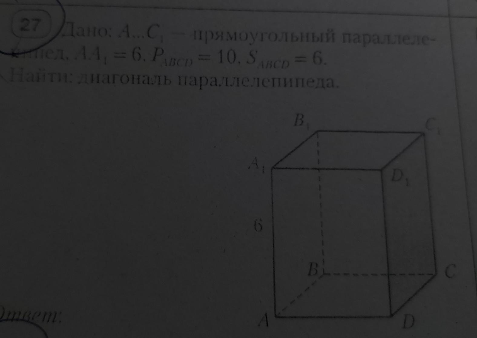 Дано: А...С - прямоугольный параллеле- = ел, А4, = 6. Рувср = 10, 5BCD = 6. Найти: диагональ параллелепипеда.