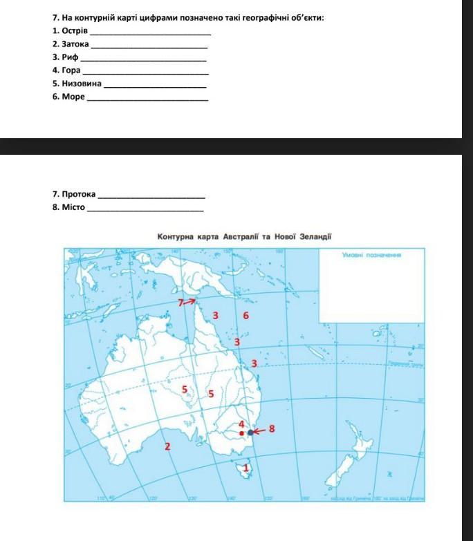 1). Тасманія, 2). Велика Австралійська Затока або Залив, 3). Великий Бар'єрний Ріф, 4). Австралійські Альпи або Гора Косцюшко, 5). Центральна низовина, 6). Коралове море, 7). Торресова Протока, 8). Місто Канберра.