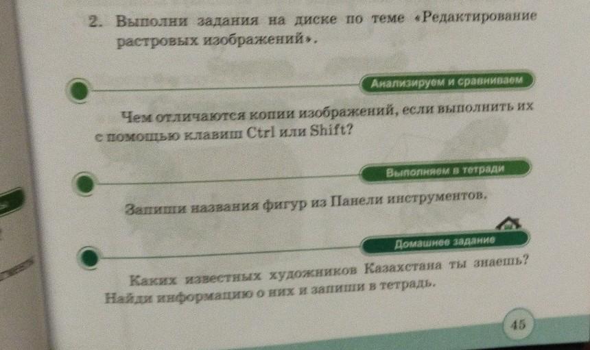 2. Выполни задания на диске по теме << Редактирование растровых изображений». Анализируем и сравниваем Чем отличаются копии изображений, если выполнить их с помощью клавиш Ctrl или Shift? Выполняем в тетради Запиши названия фигур из Панели инструментов. Домашнее задание Каких известных художников Казахстана ты знаешь? Найди информацию о них и запиши в тетрадь.