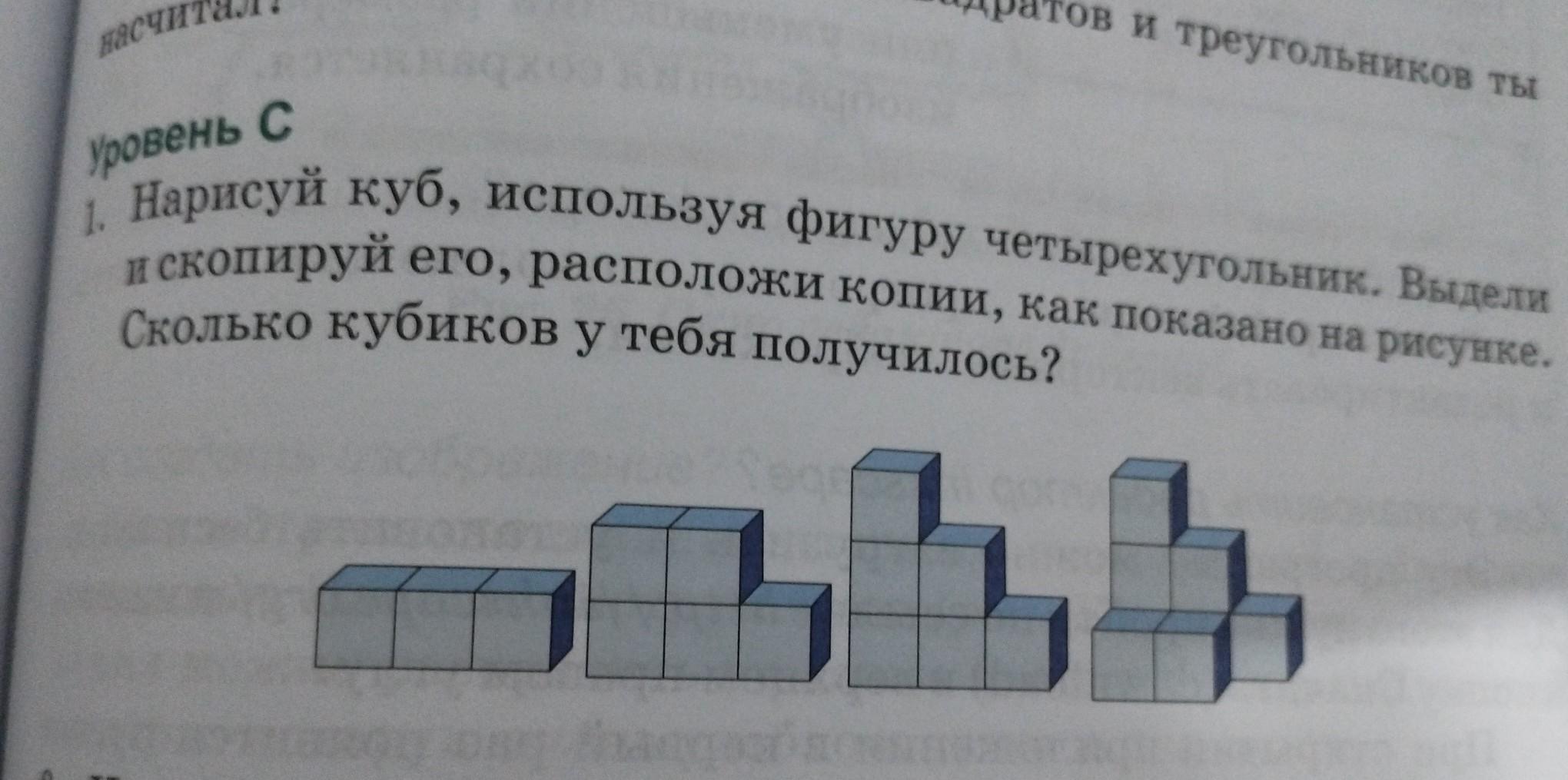 Уровень С 1. Нарисуй куб, используя фигуру четырехугольник. Выдели и скопируй его, расположи копии, как показано на рисунке. Сколько кубиков у тебя получилось?