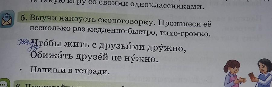 2 Выучи наизусть скороговорку. Произнеси её несколько раз медленно быстро, тихо громко. чтобы жить с друзьями дружно, Обижать друзей не нужно. Напиши в тетради.