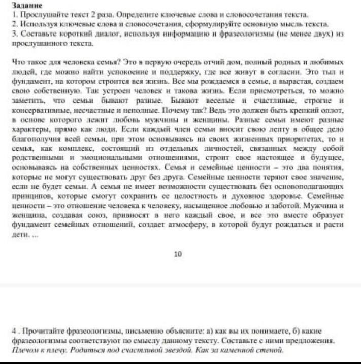 ДАЮ 40 БАЛЛОВ ЗА ПРАВИЛЬНЫЕ ОТВЕТЫ:Задание 1. Прослушайте текст 2 раза. Определите ключевые слова и словосочетания текста. 2. Используя ключевые слова и словосочетания, сформулируйте основную мысль текста. 3. Составьте короткий диалог, используя информацию и фразеологизмы (не менее двух) из прослушанного текста. Что такое для человека семья? Это в первую очередь отчий дом, полный родных и любимых людей, где можно найти успокоение и поддержку, где все живут в согласин. Это тыл и фундамент, на котором строится вся жизнь. Все мы рождаемся в семье, а вырастал, создаем свою собственную. Так устроен человек и такова жизнь. Если присмотреться, то можно заметить, что семьи бывают разные. Бывают веселые и счастливые, строгие и консервативные, несчастные и неполные. Почему так? Ведь это должен быть крепкий оплот, в основе которого лежит любовь мужчины и женщины. Разные семьи имеют разные характеры, прямо как люди. Если каждый член семьи вносит свою лепту в общее дело благополучня всей семьи, при этом основываясь на своих жизненных приоритетах, то н семья, как комплекс, состоящий из отдельных личностей, связанных между собой родственными и эмоциональными отношениями, строит свое настоящее и будущее, основываясь на собственных ценностях. Семья и семейные ценности - это два понятия. которые не могут существовать друг без друга. Семейные ценности теряют свое значение, если не будет семьи. А семья не имеет возможности существовать без основополагающих принципов, которые смогут сохранить ее целостность и духовное здоровье. Семейные ценности - это отношение человека к человеку, насыщенное любовью и заботой. Мужчина и женщина, создавая союз, привносят в него каждый свое, и все это вместе образует фундамент семейных отношений, создаст атмосферу, в которой будут рождаться и расти дети..... 10 4. Прочитайте фразеологизмы, письменно объясните: а) как вы их понимаете, б) какие фразеологизмы соответствуют по смыслу ланному тексту. Составьте с ними предложения. Плечом к плечу. Родиться под счастливой звездой. Как за каменной стеной