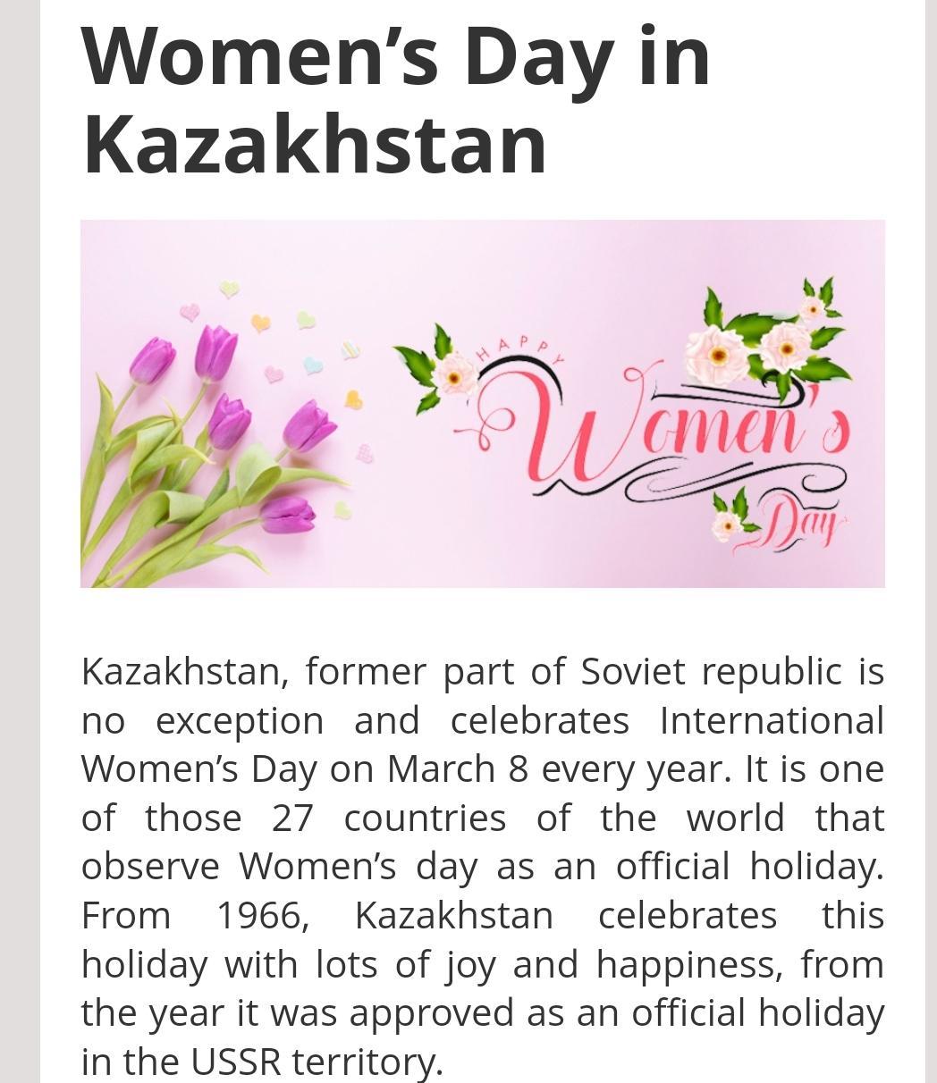 Women's Day in Kazakhstan is on March, 8.