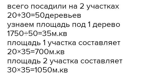 На двух земельных участках общей площадью 1750 метров в квадрате посадили фруктовые деревья.На одном участке посадили 20 деревьев, на другом 30. Под каждое дерево отведена одинаковая площадь. Определите площадь каждого участка. Скажите пожалуйста условие