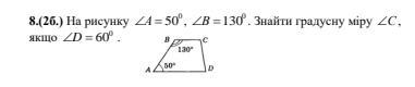 <А та <В-внутрішні односторонні. <А+<В=130+50=180°, це свідчить про те що ВС || АД. тоді якщо кут Д=60°, а сума внутрішніх односторонніх кутів 180°, отже з цього випливає що кут С=180-60=120°
