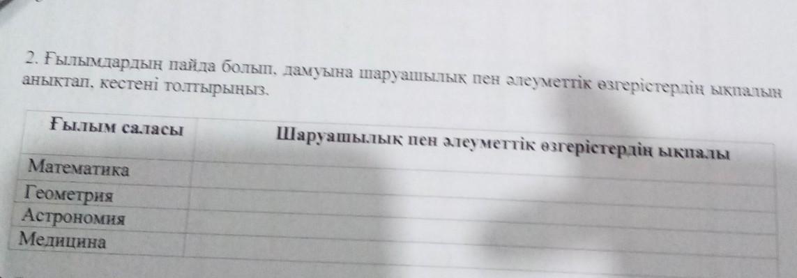 2. Ғылымдардың пайда болып, дамуына шаруашылық пен әлеуметтік өзгерістердің ықпалын аныктап, кестені толтырыныз. Шаруашылық пен әлеуметтік өзгерістердің ықпалы Ғылым саласы Математика Геометрия Астрономия Медицина ипот 19