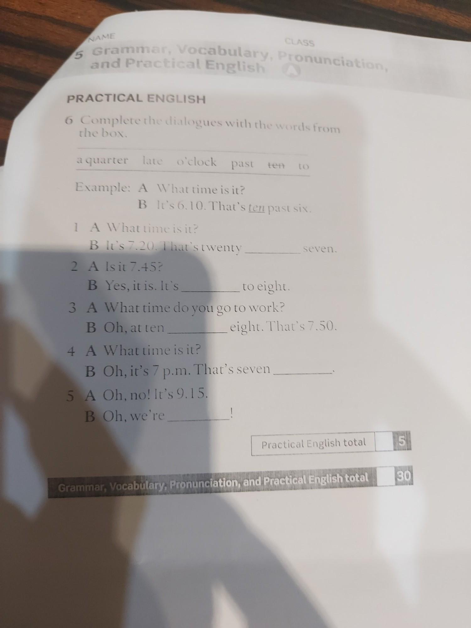 6 Complete the dialogues with the words from the box. a quarter Example: A What time is it? late o'clock past ten to B It's 6.10. That's ten past six. 1 A What time is it? B It's 7.20. That's twenty 2 A Is it 7.45? B Yes, it is. It's to eight. 3 A What time do you go to work? B. Oh, at ten 4 A What time is it? B Oh, it's 7 p.m. That's seven 5 A Oh, no! It's 9.15. B Oh, we're seven. eight. That's 7.50. Practical English total