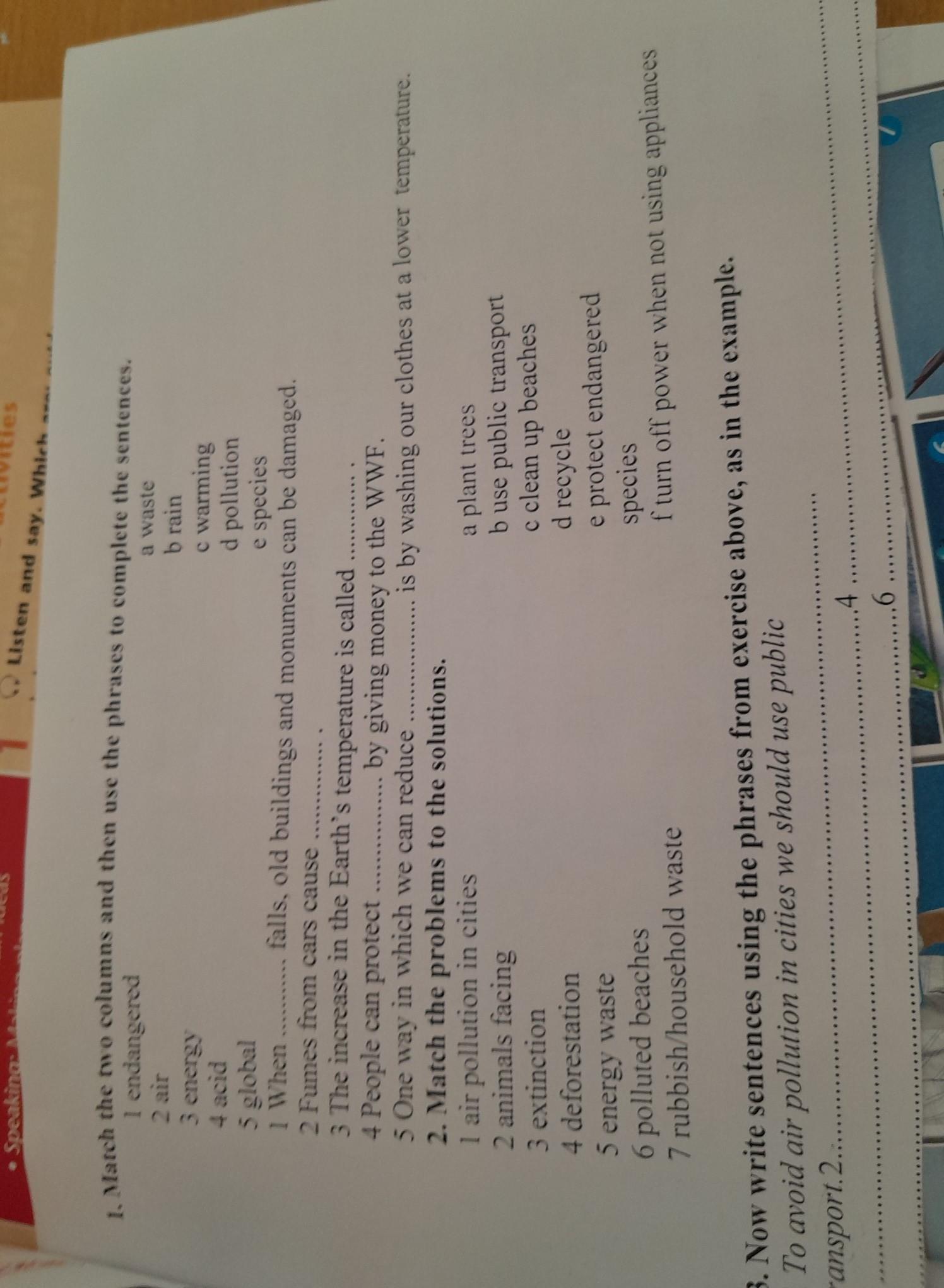 2. Match the problems to the solutions. 1 air pollution in cities 2 animals facing 3 extinction 4 deforestation 5 energy waste 6 polluted beaches 7 rubbish/household waste a plant trees b use public transport c clean up beaches d recycle e protect endangered species f turn off power when not using appliance